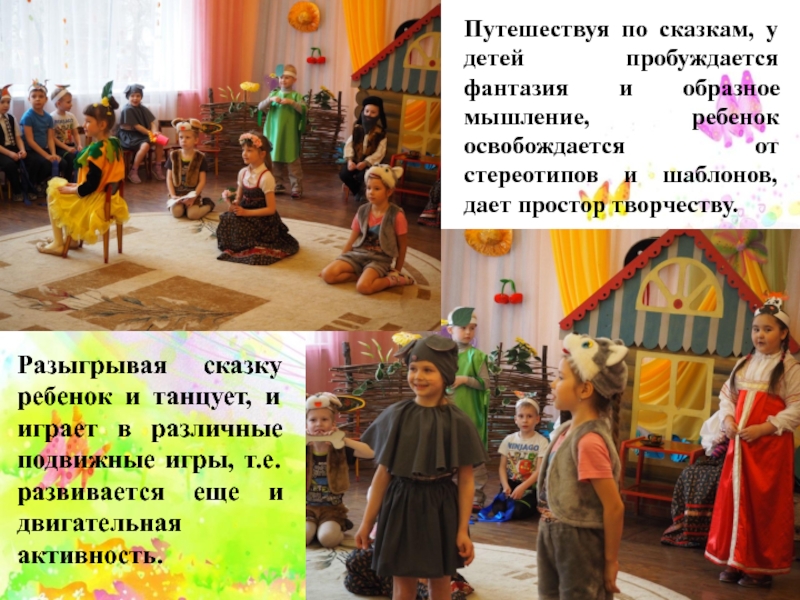 Слайд 24Путешествуя по сказкам, у детей пробуждается фантазия и образное мышление, ребенок