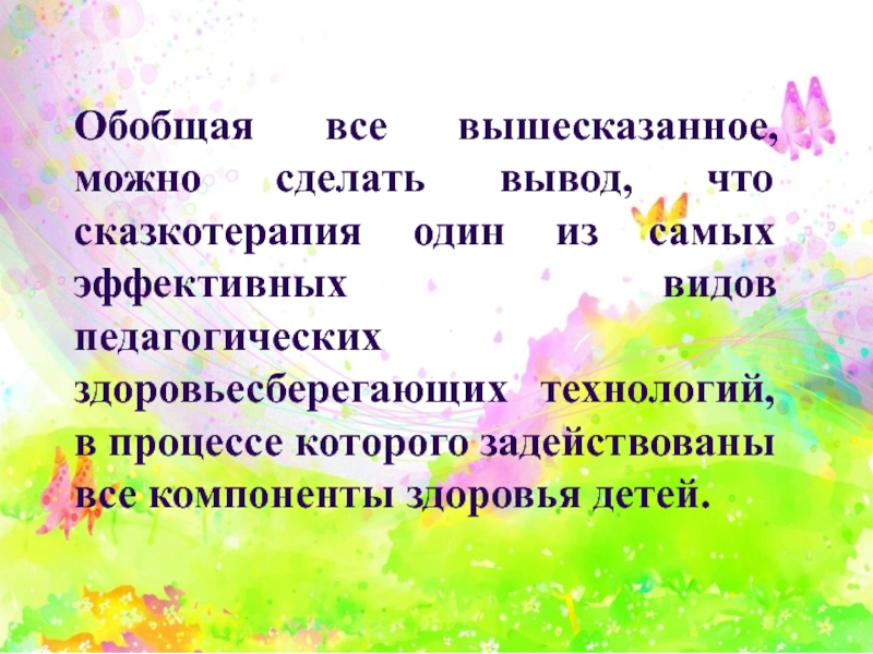 Слайд 26Обобщая все вышесказанное, можно сделать вывод, что сказкотерапия один из самых