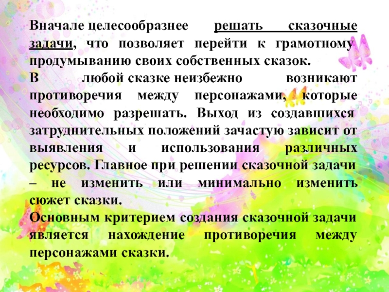 Основным критерием создания сказочной задачи является нахождение противоречия между персонажами сказки.