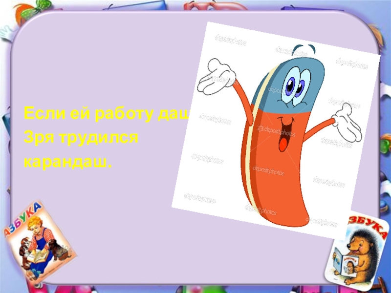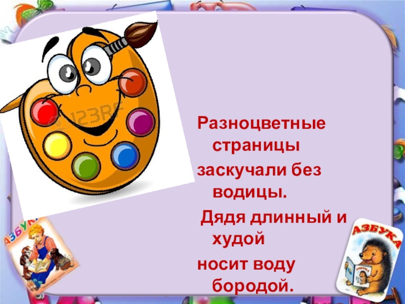 Разноцветные страницы заскучали без водицы. Дядя длинный и худой носит воду бородой.