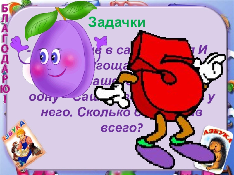 Задачки - Дима слив в саду нарвал И ребят он угощал: Одну сливу дал Наташе, Одну –