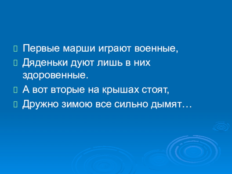 Первые марши играют военные,Дяденьки дуют лишь в них здоровенные.А вот вторые на крышах стоят,Дружно зимою все сильно
