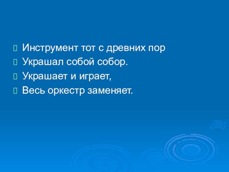 Инструмент тот с древних порУкрашал собой собор.Украшает и играет,Весь оркестр заменяет.