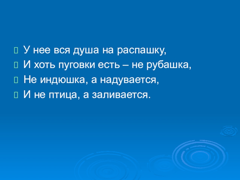 У нее вся душа на распашку,И хоть пуговки есть – не рубашка,Не индюшка, а надувается,И не птица, а заливается.
