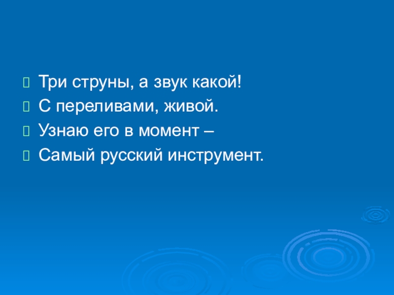 Три струны, а звук какой!С переливами, живой.Узнаю его в момент –Самый русский инструмент.