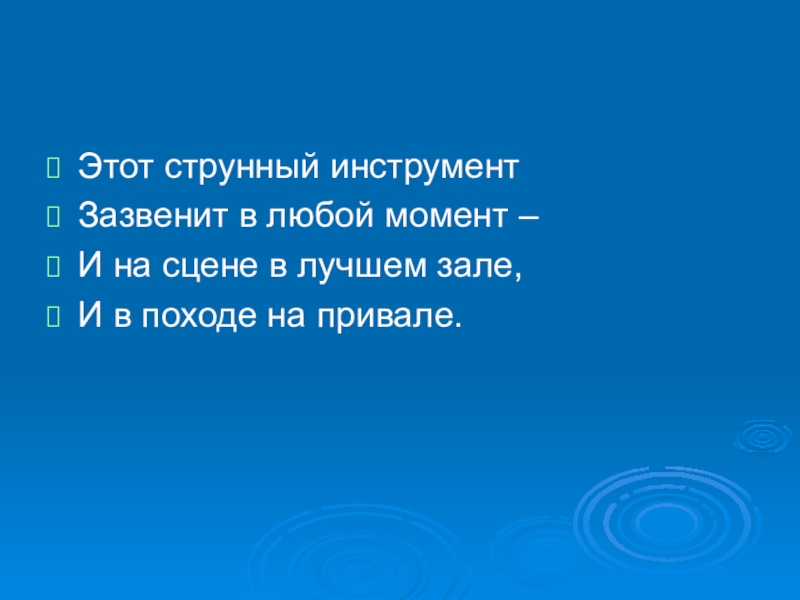 Этот струнный инструментЗазвенит в любой момент –И на сцене в лучшем зале,И в походе на привале.