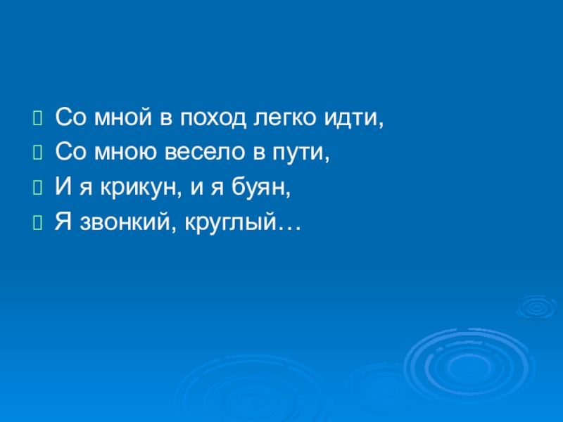 Со мной в поход легко идти,Со мною весело в пути,И я крикун, и я буян,Я звонкий, круглый…