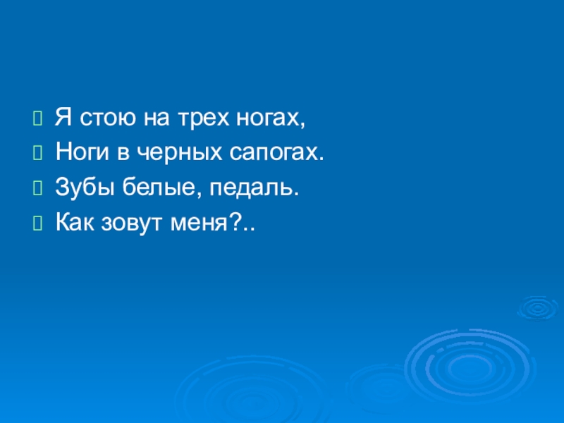 Я стою на трех ногах,Ноги в черных сапогах.Зубы белые, педаль.Как зовут меня?..