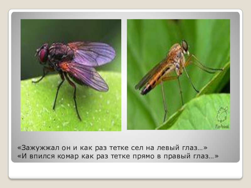 Слайд 2«Зажужжал он и как раз тетке сел на левый глаз…» «И впился