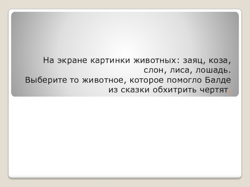 На экране картинки животных: заяц, коза, слон, лиса, лошадь. Выберите то животное, которое помогло Балде из сказки