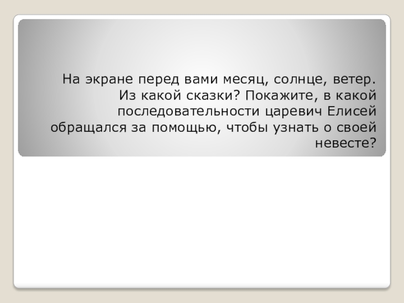 На экране перед вами месяц, солнце, ветер. Из какой сказки? Покажите, в какой последовательности царевич Елисей обращался