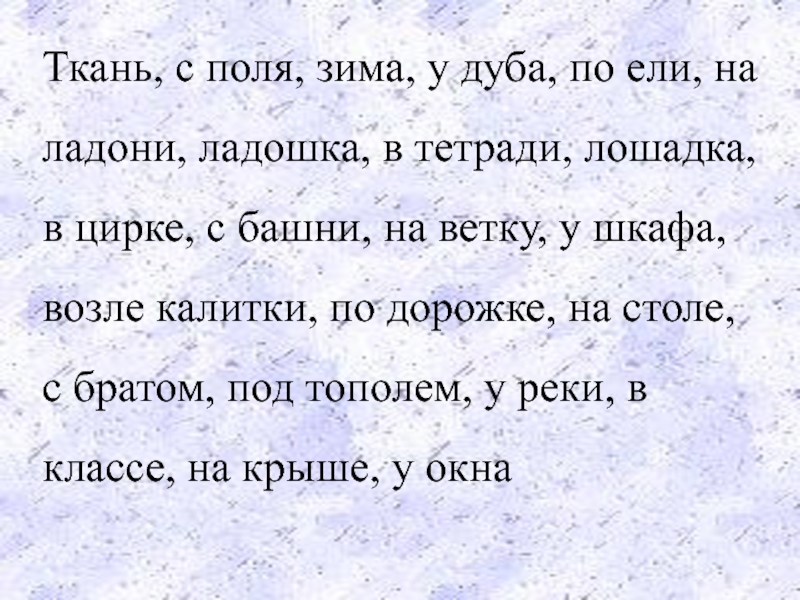 Слайд 11Ткань, с поля, зима, у дуба, по ели, на ладони, ладошка,