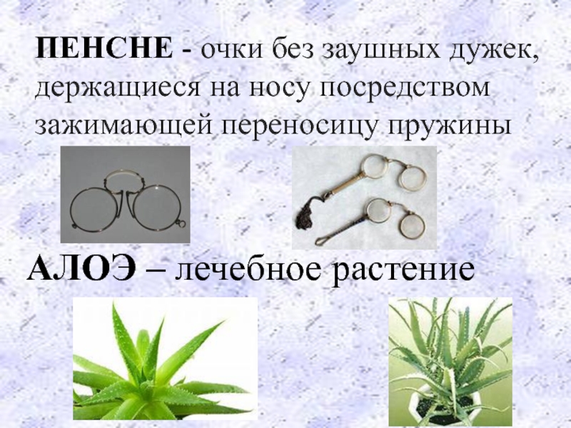 АЛОЭ – лечебное растениеПЕНСНЕ - очки без заушных дужек, держащиеся на носу посредством зажимающей переносицу пружины