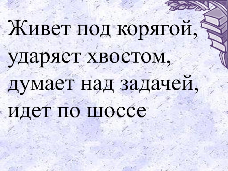 Слайд 5Живет под корягой, ударяет хвостом, думает над задачей, идет по шоссе