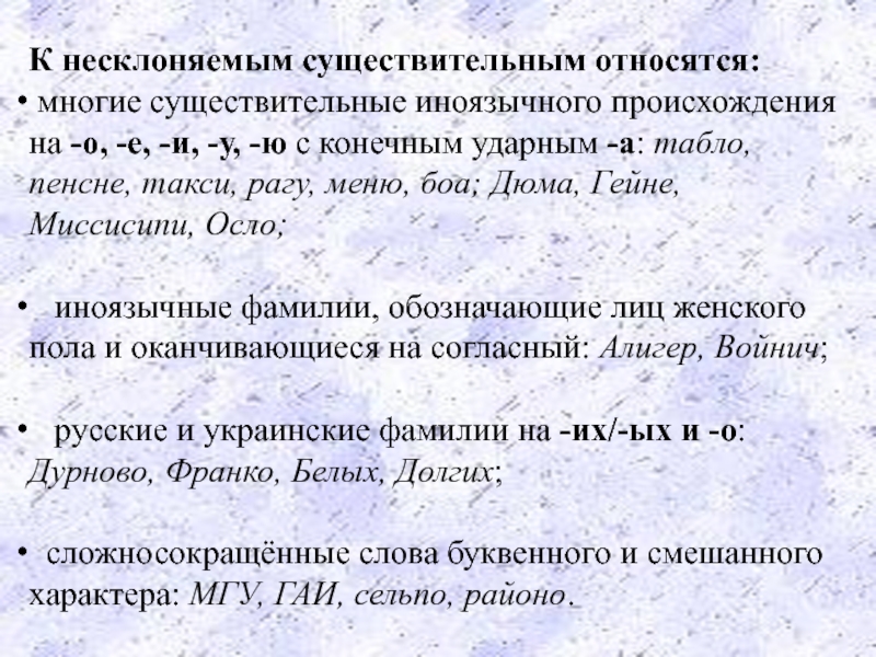 К несклоняемым существительным относятся: многие существительные иноязычного происхождения на -о, -е, -и, -у, -ю с конечным ударным