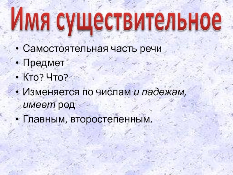 Самостоятельная часть речиПредметКто? Что?Изменяется по числам и падежам, имеет родГлавным, второстепенным.