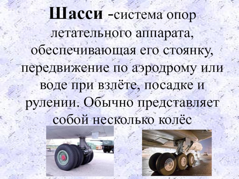 Шасси -система опор летательного аппарата, обеспечивающая его стоянку, передвижение по аэродрому или воде при взлёте, посадке и рулении. Обычно