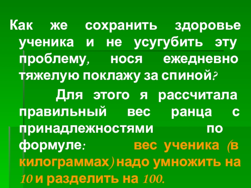 Для этого я рассчитала правильный вес ранца с принадлежностями по формуле: вес ученика (в килограммах) надо умножить на 10 и разделить на 100.