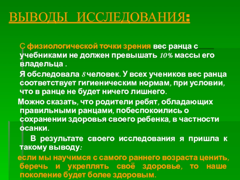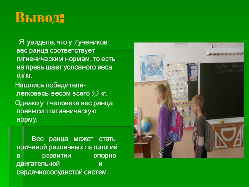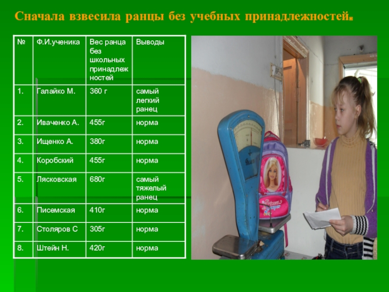 Я обследовала 8 человек. У всех учеников вес ранца соответствует гигиеническим нормам, при условии, что в ранце не будет ничего лишнего.