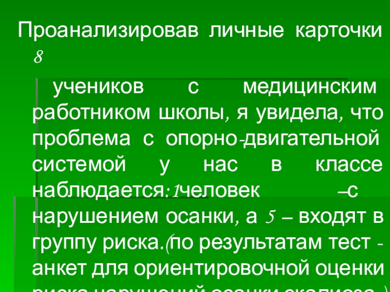 что проблема с опорно-двигательной системой у нас в классе наблюдается:1человек –с нарушением осанки, а 5 – входят в группу риска.(по результатам тест - анкет для ориентировочной оценки риска нарушений осанки,скалиоза.)