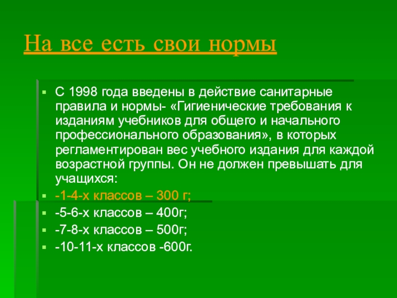 правила и нормы- «Гигиенические требования к изданиям учебников для общего и начального профессионального образования», в которых регламентирован вес учебного издания для каждой возрастной группы. Он не должен превышать для учащихся: