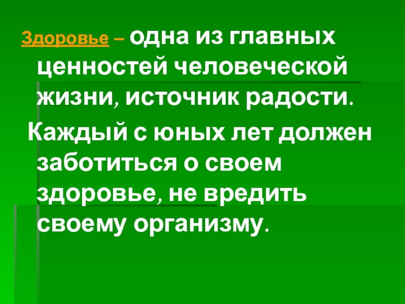 Слайд 7Здоровье – одна из главных ценностей человеческой жизни, источник радости.