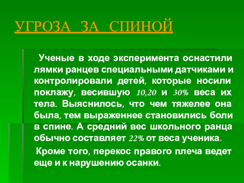 специальными датчиками и контролировали детей, которые носили поклажу, весившую 10,20 и 30% веса их тела. Выяснилось, что чем тяжелее она была, тем выраженнее становились боли в спине. А средний вес школьного ранца обычно составляет 22% от веса ученика.