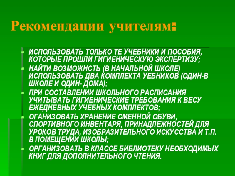 ПРИ СОСТАВЛЕНИИ ШКОЛЬНОГО РАСПИСАНИЯ УЧИТЫВАТЬ ГИГИЕНИЧЕСКИЕ ТРЕБОВАНИЯ К ВЕСУ ЕЖЕДНЕВНЫХ УЧЕБНЫХ КОМПЛЕКТОВ;