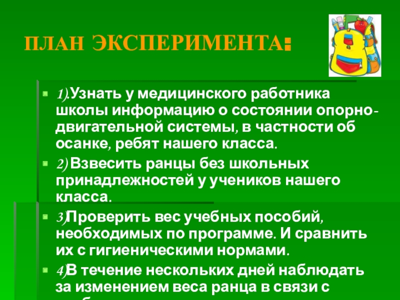 4)В течение нескольких дней наблюдать за изменением веса ранца в связи с учебными нагрузками.