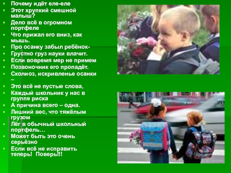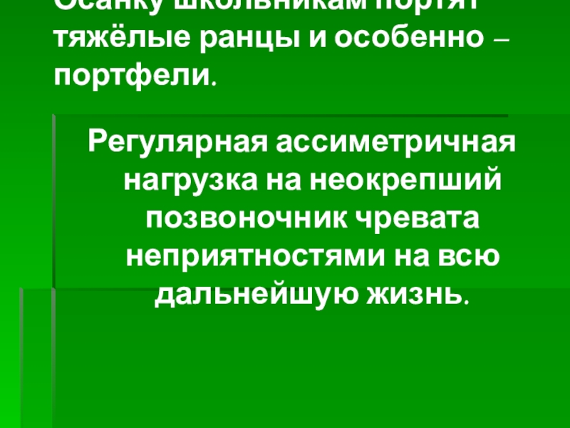 Слайд 12Осанку школьникам портят тяжёлые ранцы и особенно – портфели.