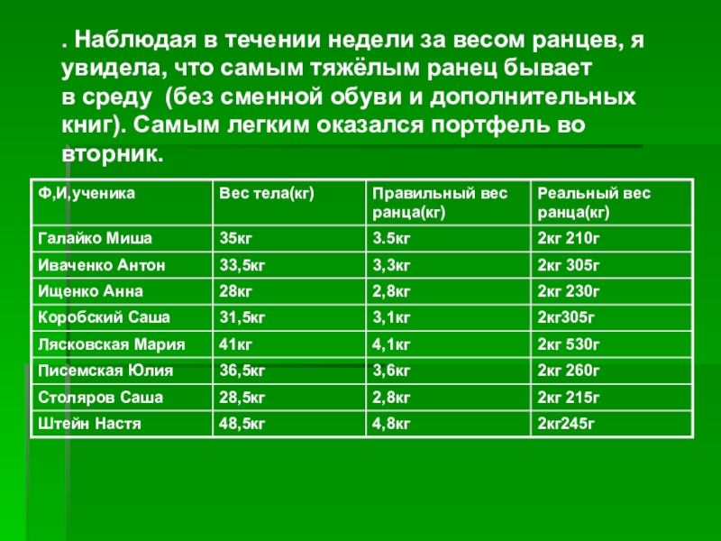 Слайд 23. Наблюдая в течении недели за весом ранцев, я увидела, что