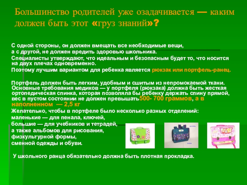 Слайд 13Большинство родителей уже озадачивается — каким должен быть этот «груз знаний»?