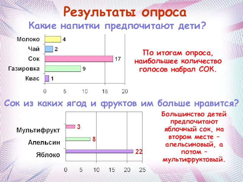Большинство детей предпочитают яблочный сок, на втором месте – апельсиновый, а потом – мультифруктовый.