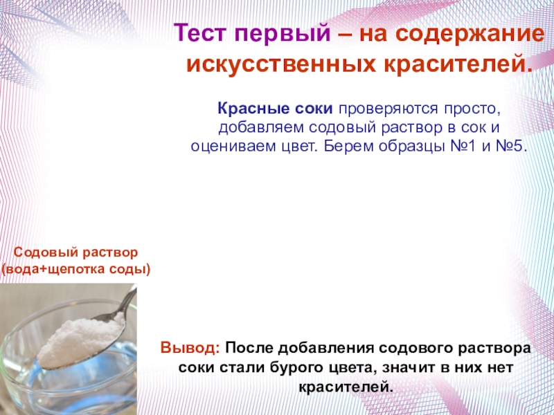 Красные соки проверяются просто, добавляем содовый раствор в сок и оцениваем цвет. Берем образцы №1 и №5.