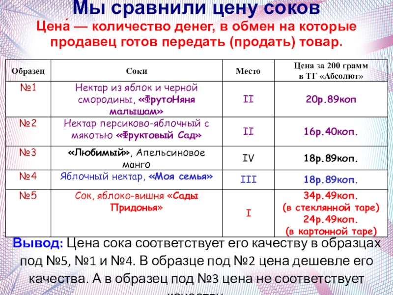 Вывод: Цена сока соответствует его качеству в образцах под №5, №1 и №4. В образце под №2 цена дешевле его качества. А в образец под №3 цена не соответствует качеству.