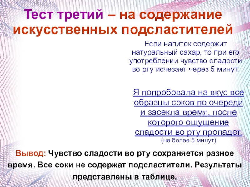Если напиток содержит натуральный сахар, то при его употреблении чувство сладости во рту исчезает через 5 минут.