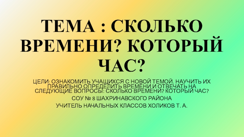 НАУЧИТЬ ИХ ПРАВИЛЬНО ОПРЕДЕЛИТЬ ВРЕМЕНИ И ОТВЕЧАТЬ НА СЛЕДУЮЩИЕ ВОПРОСЫ: СКОЛЬКО ВРЕМЕНИ? КОТОРЫЙ ЧАС?