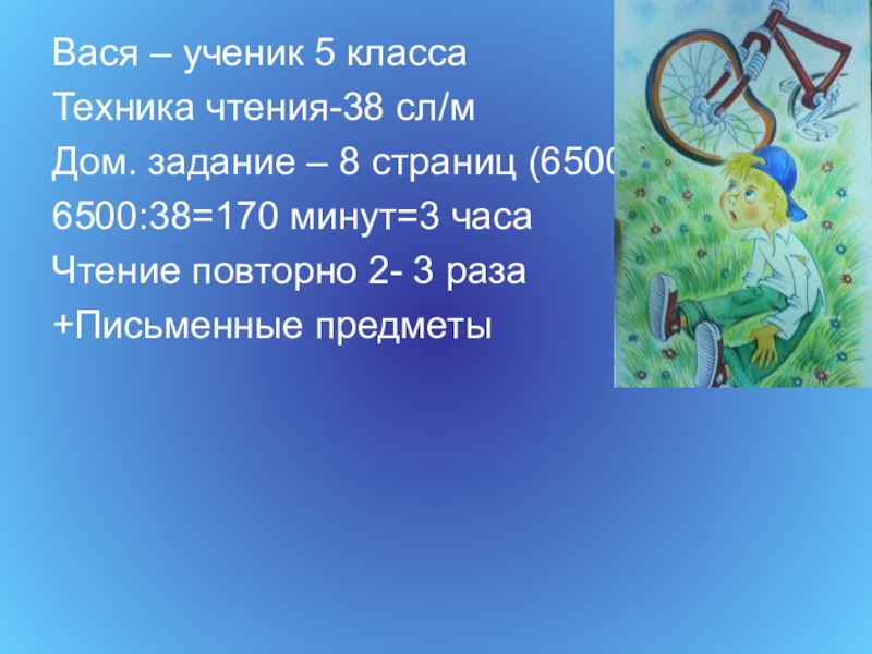 Вася – ученик 5 классаТехника чтения-38 сл/мДом. задание – 8 страниц (6500 слов)6500:38=170 минут=3 часаЧтение повторно 2-