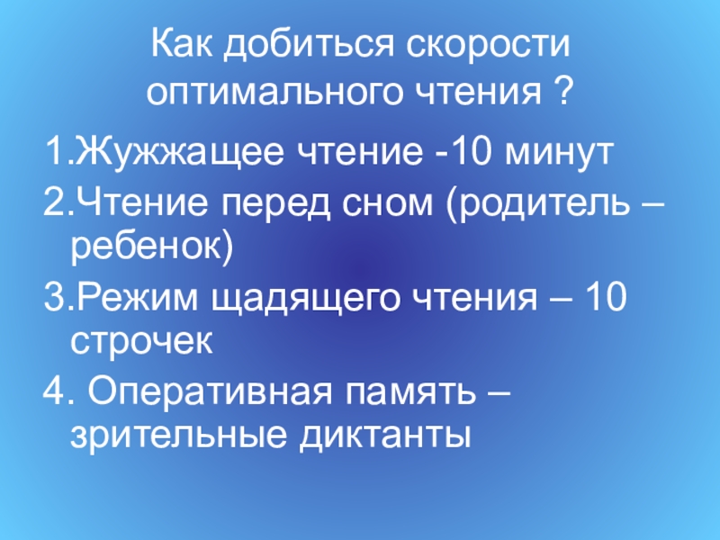 Как добиться скорости оптимального чтения ?1.Жужжащее чтение -10 минут2.Чтение перед сном (родитель –ребенок)3.Режим щадящего чтения – 10