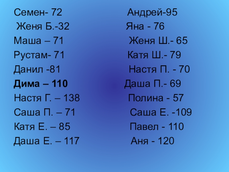 Семен- 72            Андрей-95 Женя Б.-32