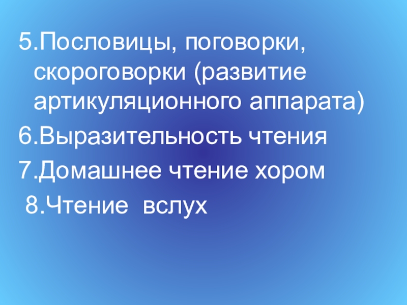 5.Пословицы, поговорки, скороговорки (развитие артикуляционного аппарата)6.Выразительность чтения7.Домашнее чтение хором 8.Чтение вслух