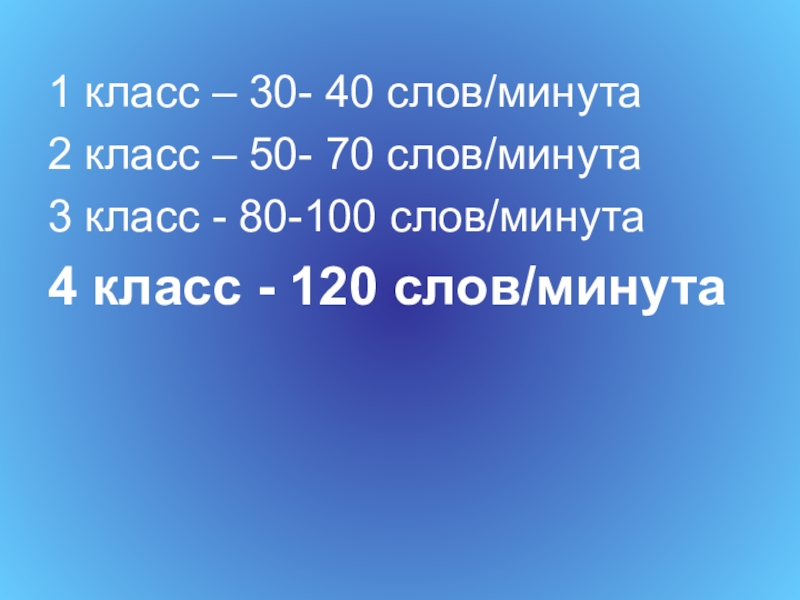 1 класс – 30- 40 слов/минута2 класс – 50- 70 слов/минута3 класс - 80-100 слов/минута4 класс - 120 слов/минута