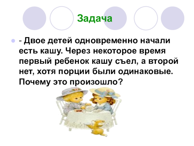 - Двое детей одновременно начали есть кашу. Через некоторое время первый ребенок кашу съел, а второй нет, хотя порции были одинаковые. Почему это произошло?