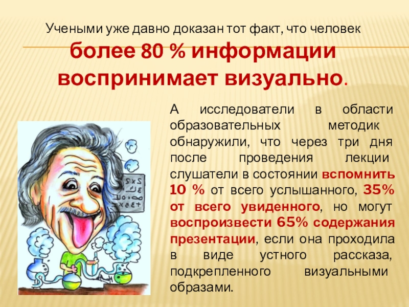 А исследователи в области образовательных методик обнаружили, что через три дня после проведения лекции слушатели в состоянии вспомнить 10 % от всего услышанного, 35% от всего увиденного, но могут воспроизвести 65% содержания презентации, если она проходила в виде устного рассказа, подкрепленного визуальными образами.