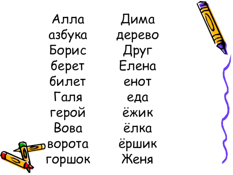 Алла азбука Борис берет билет Галя герой Вова ворота горшокДимадеревоДругЕленаенотедаёжикёлка ёршикЖеня