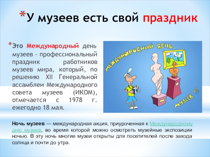 Ночь музеев — международная акция, приуроченная к Международному дню музеев, во время которой можно осмотреть музейные экспозиции ночью. В эту ночь многие музеи открыты для посетителей после захода солнца и почти до утра.