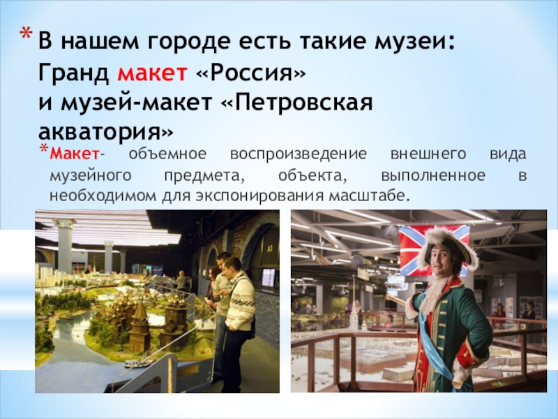 Макет- объемное воспроизведение внешнего вида музейного предмета, объекта, выполненное в необходимом для экспонирования масштабе.