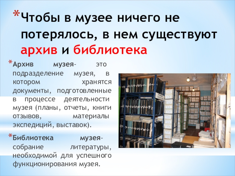 Архив музея- это подразделение музея, в котором хранятся документы, подготовленные в процессе деятельности музея (планы, отчеты, книги отзывов, материалы экспедиций, выставок).