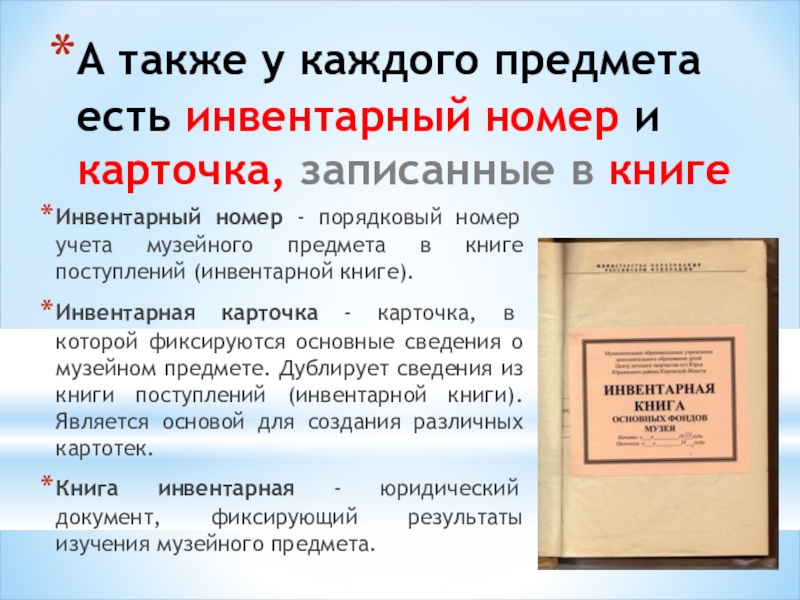 Книга инвентарная - юридический документ, фиксирующий результаты изучения музейного предмета.