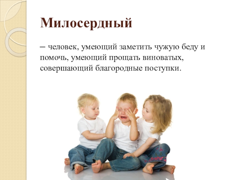 Милосердный– человек, умеющий заметить чужую беду и помочь, умеющий прощать виноватых, совершающий благородные поступки.